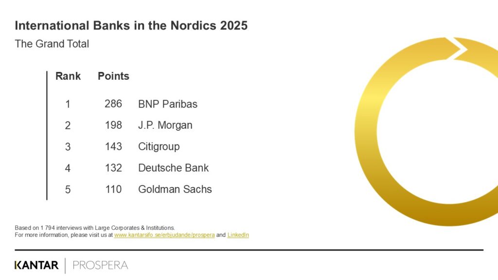 BNP Paribas has been ranked the International Bank with the highest client satisfaction in 2025. The research is based on 1794 telephone and online interviews during 2025 with large Corporate and Institutional clients across Denmark, Norway, Sweden and Finland, and covering eight underlying key Prospera reports covering relationship management, the Large Corporate & Institutional Banking, and the products Cash Management, Syndicated Loans, DCM, Interest Derivatives, FX and Equities. In each Prospera report the international banks with a minimum coverage of approx. 15 clients in the Nordics are ranked according to their Overall Performance; their overall client satisfaction.